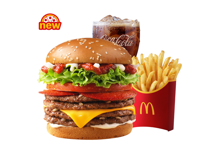 • 구성: 더블 피자 버거에서 순쇠고기 패티가 4장으로 늘어난 버전입니다.
